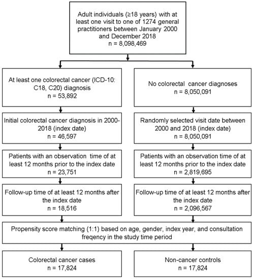 This retrospective cohort study included adult individuals (≥18 years) with an initial diagnosis of colorectal cancer (CRC, ICD-10: C18, C20) in 1274 general practices in Germany between January 2000 and December 2018 (index date; Figure 1). Further inclusion criteria were an observation time of at least 12 months prior to and a follow-up time of at least 12 months after the index date. CRC patients were matched to individuals without CRC (controls) by propensity scores based on age, gender, index year, and consultation frequency within 12 months prior to and 12 months after the index date. For the control group, the index date was defined as a randomly selected visit between January 2000 and December 2018 (Figure 1).