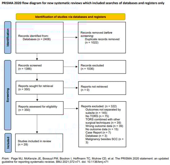 This systematic review was performed following the Preferred Reporting Items for Systematic Reviews and Meta-Analyses (PRISMA) guidelines [19]. Two authors (N.S.P. and T.C.) developed search strategies for the following databases: PubMed (National Library of Medicine, National Institutes of Health); Scopus (Elsevier); and CINAHL (EBSCO) to identify studies for inclusion. These strategies used a combination of subject headings (e.g., Medical Subject Headings [MeSH] in PubMed) and keywords for the concepts oropharyngeal squamous cell carcinoma and TORS. The PubMed search strategy was developed first and then used to design the search strategies for the other two databases; MeSH terms were replaced with appropriate subject headings and similar keywords when available. The search strategies are detailed in Appendix A. The databases were searched from inception to 28 February 2022. The reference lists of relevant articles and citing articles were manually searched to confirm the search strategy and identify additional articles. All the articles were uploaded to the review management software Covidence (Veritas health innovation Ltd., Melbourne, Australia) and screened for relevance.
