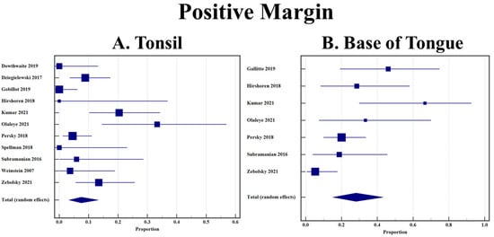 A total of 12 studies included extractable data on margin status after resection using TORS [12,26,27,28,29,30,31,32,33,34,35,36]. BOT OPSCC had a statistically significant higher rate of positive margins when compared to tonsillar OPSCC (28.1% [95% CI 15.1–43.3] vs. 7.5% [95% CI 3.3–13.3]). Both forest plots are shown in Figure 3A,B.