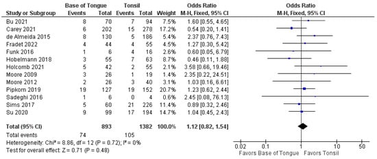 The recurrence of OPSCC after TORS was analyzed by subsite in 13 studies [37,38,39,40,41,42,43,44,45,46,47,48,49]. There was no statistically significant difference in the odds of total recurrence between tonsillar and BOT OPSCC (1.1 [95%CI 0.8–1.5], p = 0.480) (Figure 4).