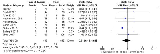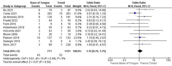 Regarding rates of postoperative hemorrhage, our study did not find any statistical differences between tonsillar and BOT OPSCC (10.7% and 8.8%). These rates are similar to postoperative hemorrhage in all cases after TORS, which is reported to be between 1.5% and 13.0% [68,69,70,71,72]. As postoperative hemorrhage after TORS can cause mortality, decreasing the risk factors for this complication is crucial to improving surgical care [71]. The literature is limited in directly comparing hemorrhage rates between tonsil and BOT. One study endorsed no differences in both univariate and multivariate analyses [73], but two other studies, including one national database, found that tonsillar OPSCC had higher odds of experiencing postoperative hemorrhage when compared to BOT [74,75]. Neither study had complete explanations for why tonsillar OPSCC had higher hemorrhage rates but argued that it could be due to an increased likelihood that T3 or T4 tumors of the tonsils were being removed with TORS, while T3 and T4 BOT OPSCC would almost exclusively undergo an open approach [74,75]. Since T3 and T4 tumors involve the larger arteries around the tonsillar fossa, theoretically, there could be a higher chance of hemorrhage [74,75]. One of these studies felt that it was more multifactorial secondary to platelet dysfunction, antithrombotic medications, or hepatic insufficiencies [75]. While our study endorsed no differences, the BOT confidence interval was very wide (1.5% to 21.3%), secondary to only three studies with extractable data. Therefore, we feel that this finding should be interpreted with caution and should be used as a hypothesis-generating finding for future research.