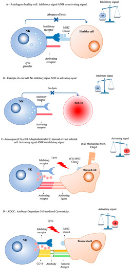 NK cells’ cytotoxicity: A balance between activation and inhibition. (A) In autologous settings, NK inhibitory receptors (e.g., KIR or CD94/NKG2A) recognize self-HLA class I ligands. Autologous healthy cells do not express any stress ligand; inhibitory signals dominate. (B) Red cells do not express HLA class I molecules or stress ligands; inhibitory signals dominate. (C) (C1): Stressed cells (tumor or virus-infected cells) can negatively modulate HLA class I ligands and express activating stress ligands. (C2): Haploidentical recipient leukemic cells express activating stress ligands and HLA class I molecules that are not recognized by donor NK cells. Alloreactive donor NK cells kill recipient tumoral cells via a KIR ligand mismatch. (D) NK cells express Fcγ receptors such as CD16. CD16 binds to the Fc region of the antibody, which binds to tumoral antigens and provoke NK cell degranulation.
