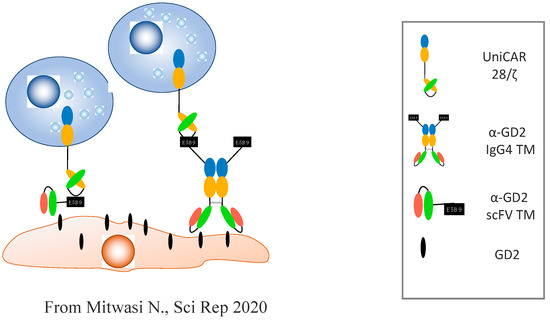- Mitwasi, N.; Feldmann, A.; Arndt, C.; Koristka, S.; Berndt, N.; Jureczek, J.; Loureiro, L.R.; Bergmann, R.; Máthé, D.; Hegedüs, N. “UniCAR”-modified off-the-shelf NK-92 cells for targeting of GD2-expressing tumour cells. Sci. Rep. 2020, 10, 1–16. [Google Scholar] [CrossRef]