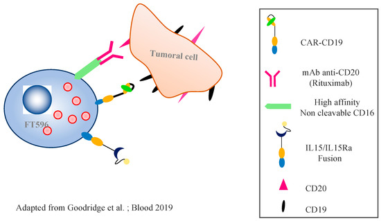 The FT596 product is the first “ready to use”, universal, and allogenic CAR NK cellular product derived from iPSCs to be authorized for use in clinical studies in the USA [58]. It is composed of an anti-CD19 CAR optimized for NK cells, with a transmembrane domain for the activator receptor NKG2D, a 2B4 costimulatory domain, and a CD3ζ signalization domain. Two key components have been added: (i) a novel, high-affinity, non-cleavable CD16 Fc receptor (hnCD16) that enables tumor targeting and enhanced antibody-dependent cell cytotoxicity without negative regulation, in combination with a therapeutic monoclonal antibody targeting the tumor cells; and (ii) an IL-15/IL-15 receptor fusion protein (IL-15RF) promoting cytokine-independent persistence (Figure 4). When used in combination with monoclonal antibodies such as rituximab (anti-CD20), the hnCD16 Fc receptor of FT596 binds to the Fc portion of the monoclonal antibodies covering the tumoral cells, activating the NK cells, the secretion of cytokines, and enhanced ADCC. IL-15RF promotes the cytotoxicity of the NK cells and the activated antitumor T cells. FT596′s action uses three different and complementary pathways: the anti-CD19 CAR, ADCC via the anti-CD20, and IL-15. A communication during ASH 2020 reported the case of a 76-year-old woman with relapsed refractory DLBCL after eight lines of treatment, including ASCT, autologous adoptive T-cell therapy, and activated haploidentical NK cells [59].