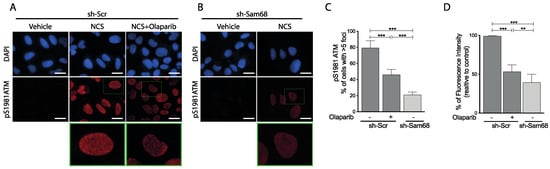 Sam68 was previously reported to promote the DDR signaling pathway in some cellular systems [42,43,44]. To test whether Sam68 is also involved in activation of the DDR pathway in PC cells, we depleted its expression in androgen-deprivation-sensitive (LNCaP) and -resistant (22Rv1) cells by lentiviral transduction of a short hairpin RNA (shRNA). PC cells were then treated with the radiomimetic drug neocarzinostatin (NCS) to induce DNA damage. First, we assessed that silencing of Sam68 was maintained for the whole time-course (Supplementary Figure S2A,B). Next, we evaluated the phosphorylation/activation of ATM as a marker of DDR induction. Western blot analyses indicated that phosphorylation of ATM was reduced in LNCaP and 22Rv1 cells depleted of Sam68, whereas no changes in the total expression levels of ATM wereobserved (Supplementary Figure S2A,B). The inhibition of ATM phosphorylation was more pronounced in 22Rv1 cells than in LNCaP cells, in line with higher efficiency of Sam68 depletion in the former cell line (Supplementary Figure S2A,B). In response to DDR activation, phosphorylated ATM is recruited to foci of DNA lesions to induce the repair pathway [1,2]. We found that NCS induced the formation of foci of phosphorylated (pS1981) ATM in the majority of LNCaP cells, an effect that was repressed by the PARP inhibitor olaparib (Figure 1A,C,D). An even stronger reduction in pS1981-ATM foci and overall nuclear fluorescence intensity was observed in Sam68-depleted LNCaP cells treated with NCS (Figure 1A–D). Thus, as previously observed in other cell types [42,43,44], Sam68 is required for proper activation of the DDR pathway in PC cells as well.