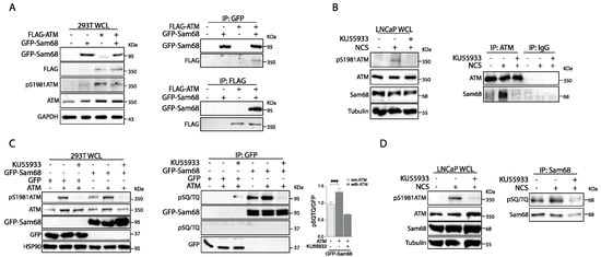 Sam68 interacts with ATM kinase, and it is phosphorylated on SQ/TQ motif upon DDR induction. (A) HEK293T cells were transiently transfected with a combination of different constructs that allow the overexpression of the fusion proteins GFP-Sam68 (pCDNA GFP-Sam68) and ATM-Flag (pCDNA FLAG-ATM) as indicated. Representative western blot of total protein extracts (whole-cell lysate, WCL) (293T WCL) and protein extracts subjected to co-immunoprecipitation assay. Co-immunoprecipitations were performed using anti-GFP (IP: GFP) or anti-FLAG (IP: FLAG) antibodies and immunoblotted with the indicated antibodies. (B) LNCaP cells were treated, or not, with KU55933 10 μM for 2 h and/or neocarzinostatin (NCS) 500 ng/mL for 1 h. Representative western blot of total protein extracts and protein extracts (LNCaP WCL) subjected to co-immunoprecipitation assay using anti-ATM (IP: ATM) antibody and IgG (IgG) as negative control. (C) HEK293T cells were transiently transfected as in (A) and treated, or not, KU55933 10 μM for 2 h. Representative western blot of WCL (293T WCL) and protein extracts subjected to immunoprecipitation assay using anti-GFP (IP: GFP) and immunoblotted with the indicated antibodies. Bar graph shows the densitometric analysis of pSQ/TQ signals with respect to GFP (western blot assays) in IP experiments (n = 3; mean ± s.d., *** p < 0.001, Student’s t test). (D) PC LNCaP cells were treated, or not, with KU55933 10 μM for 2 h and/or neocarzinostatin (NCS) 500 ng/mL for 1 h. Representative western blot of total protein extracts and proteins co-immunoprecipitated with anti-Sam68 antibody (IP: Sam68).
