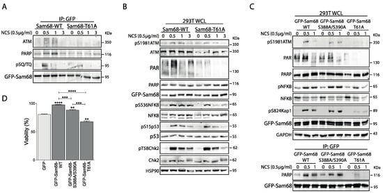 We then sought to investigate the functional link between ATM and Sam68. Sam68 interacts with PARP1 and is recruited to DNA lesions. Moreover, the Sam68/PARP1 interaction is crucial for DNA damage-initiated, PARP1-dependent PARylation [42]. T61 resides in the N-terminal region of Sam68 (Figure 3A), which is required for the interaction with PARP1 and the downstream activation of NFκB upon DDR induction [42,53]. Thus, we asked if ATM-dependent phosphorylation of T61 could selectively regulate the Sam68–PARP1–NFκB axis. To this end, HEK293T cells were transiently transfected with GFP-Sam68wt or GFP-Sam68T61A and treated with NCS for different time points. DDR induction by NCS was positively correlated with an early and transient interaction of Sam68 with both ATM and PARP1 (Figure 4A), and with an increase in total PAR chain formation in WCL (Figure 4B). Notably, both these events were reduced in the presence of the GFP-Sam68T61A mutant, indicating that phosphorylation of T61 is required for the functional interaction of Sam68 and PARP1 in response to DNA damage. Accordingly, we observed that overexpression of the GFP-Sam68T61A mutant impaired signaling downstream of ATM, as NCS-induced phosphorylation of NFκB was reduced and less sustained over time (Figure 4B). A similar effect was observed for pS824 KAP1 (Figure 4C; WCL panels), p53 and, albeit to a lesser extent, CHK2 phosphorylation (Figure 4B). Notably, the GFP-Sam68S388A/S390A mutant was still capable of interacting with PARP1 (Figure 4C; IP:GFP panels) and inducing its activity in response to DNA damage, leading to NFκB and KAP1 phosphorylation comparable to that observed in the presence of GFP-Sam68wt (Figure 4C; WCL panels). However, protein PARylation was partially reduced in cells expressing the GFP-Sam68S388A/S390A mutant (Figure 4C; WCL panels). These results indicate that the functional interaction between Sam68 and PARP1 is primarily modulated by ATM-dependent phosphorylation of T61. In line with this notion, expression of GFP-Sam68wt, and to a lesser extent of the GFP-Sam68S388A/S390A mutant, rescued viability of cells treated with NCS, whereas cells expressing GFP-Sam68T61A displayed reduced viability even when compared to GFP-expressing control cells (Figure 4D). These data provide compelling evidence that impairing ATM-dependent phosphorylation of Sam68 on T61 disrupts the Sam68–PARP1–NFκB axis and enhances cell sensitivity to DNA damage.