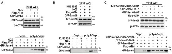 RBPs are increasingly recognized as key players in the DDR, and examples of coordinated regulation of DNA repair and RNA processing have been reported [6,7]. The RNA binding affinity of Sam68 and its activity in splicing and 3′-end processing are modulated by phosphorylation [39,54,55,56]. Thus, we asked whether post-translational modification by ATM affects the RNA binding affinity of Sam68. To address this question, HEK293T cells were transiently transfected with GFP-Sam68 in the presence or absence of Flag-ATM (Figure 5A,B; WCL panels). RNA pulldown assays showed that Sam68 specifically interacts with synthetic poly-A RNA and that activation of the DDR pathway, by either overexpression of Flag-ATM or treatment with NCS, increased its binding affinity (Figure 5A; polyA-Seph panels). Concomitant overexpression of Flag-ATM and treatment with NCS further increased the affinity of GFP-Sam68 for synthetic Poly-A RNA (Figure 5A; polyA-Seph panels). Moreover, the effect of ATM was inhibited by treatment with KU55933 (Figure 5B; polyA-Seph panels). To further test whether ATM-dependent phosphorylation was involved in this effect, we assessed the ability of Sam68 mutant isoforms to interact with poly-A synthetic RNA in the presence or absence of Flag-ATM (Figure 5C; WCL panels). Although all GFP-Sam68 mutants were able to bind RNA like the wild-type protein, mutation of T61 abolished the increase in binding observed in cells co-transfected with Flag-ATM, whereas the GFP-Sam68S388A/S390A double mutant behaved similarly to the wild-type protein (Figure 5C; polyA-Seph panels). These results suggest that, in addition to promoting the ability of Sam68 to function in the DDR pathway, ATM-dependent phosphorylation of T61 increases the affinity of Sam68 for RNA, possibly impacting onits RNA processing activity.