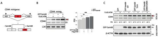 Sam68 regulates several aspects of RNA processing, including alternative splicing [39,46,55,56] and polyadenylation [29,57]. Since the splicing activity of Sam68 and other RBPs can be modulated by post-translational modifications [21,26,27,50,51] and ATM-mediated phosphorylation increases the affinity of Sam68 for RNA, we then sought to investigate whether it can also influence its RNA processing activity. To this end, we employed the CD44 exon v5 minigene as a model system to assess its splicing activity (Figure 6A). In this model gene, Sam68 was previously shown to promote inclusion of the exon v5 [46,56]. As expected, co-transfection with a suboptimal dose of Sam68 increased the inclusion of exon v5 in this splicing assay (Figure 6B). Interestingly, a small effect on exon v5 inclusion was also observed in HEK293T cells transfected with Flag-ATM. Furthermore, co-transfection of ATM with Sam68 further induced exon v5 inclusion (percentspliced in: PSI) (Figure 6B), indicating that ATM strengthens the splicing activity of Sam68. A similar effect was also observed using the Ppp3cc minigene (Supplementary Figure S3A,B), where Sam68 represses usage of an internal polyadenylation site in exon 14 and promotes selection of the last exon 16 (lower band in the gel) [57].