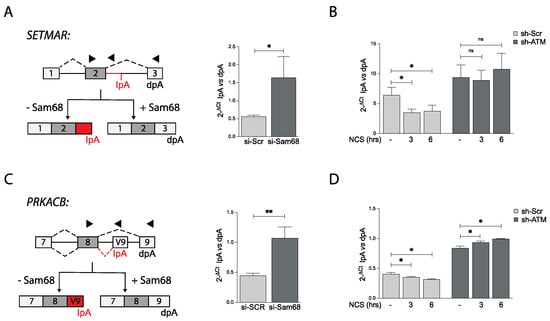 Sam68 APA activity is modulated upon DDR induction in an ATM-dependent way. (A–D) Bar graphs showing qPCR analyses of polyadenylation site (pA) usage evaluated in two representative genes (SETMAR and PRKACB) undergoing regulation in cells knocked down for Sam68 (si-Sam68) (A,C) or ATM (sh-ATM) and treated, or not, with neocarzinostatin (NCS, 500 ng/mL) for 1 and 6 h (B,D). Internal pA (IPA) usage was reported as 2−ΔCt with respect to distal pA (d-pA) (* p < 0.05, ** p < 0.01, n.s. not significant, t test) (A–D). A schematic representation of SETMAR and PRKACB alternative polyadenylation events is also shown (A,C).