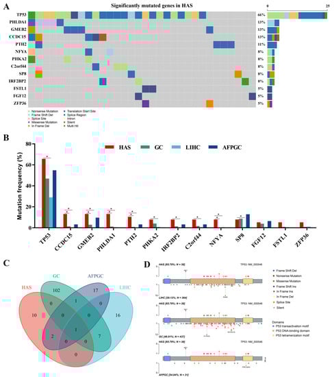 Mutational landscape of hepatoid adenocarcinoma of the stomach (HAS). (A) The significantly mutated genes (SMGs) in 38 HAS patients. Different variant types are highlighted in different colors. p < 0.001 is statistically significant. (B) Comparison of frequencies of SMGs in HAS with liver hepatocellular carcinoma (LIHC), gastric cancer (GC), and AFP-producing GC (AFPGC). * p < 0.0167, statistically significant. (C) Intersection of all SMGs in these cancers. (D) Somatic mutation site distributions of TP53.