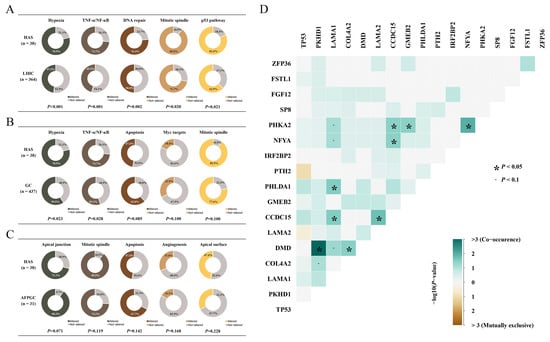 The proportion of mutated pathways. The proportion of patients with mutated genes in the described pathways and its differences in (A) HAS vs. LIHC, (B) HAS vs. GC, and (C) HAS vs. AFPGC. The curated gene sets for each pathway are obtained from the GSEA database. (D) Co-occurrence or mutual exclusivity patterns for the SMGs and representative genes. p < 0.05 is statistically significant.