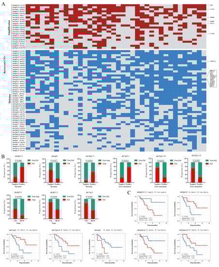 Copy number variant calling was executed in CNVkit (v0.9.9) with default parameters. CNV was classified into five levels, including deep deletion (CN = 0), shallow deletion (CN = 1), diploid (CN = 2), low-level amplification (CN = 3), and high-level amplification (CN ≥ 4). Loss of heterozygosity (LOH) was inferred with allelic frequency of germline heterozygous SNP by CNVkit. Significantly amplified and deleted genome regions were identified in GISTIC (v2.0). The definition of amplificated or deleted regions was as follows: deep deletion (CN = −2), shallow deletion (CN= −1), diploid (CN = 0), low-level amplification (CN = 1), and high-level amplification (CN = 2). The overall survival (OS) analysis of CNV was performed in amplification (high-level and low-level) vs. non-amplification, and deletion (deep and shallow) vs. nondeletion.