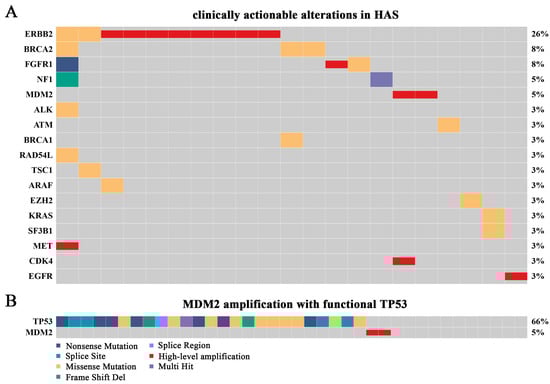 Based on the potentially drug-related targets from the oncology knowledge base (OncoKB; https://www.oncokb.org (accessed on 13 February 2022)), we systematically evaluated the landscape of clinically actionable alterations in HAS based on the results of SNVs, INDELS, high-level amplifications, and deep deletions. Microsatellite instability (MSI) status was evaluated by MANTIS (v1.0.5).