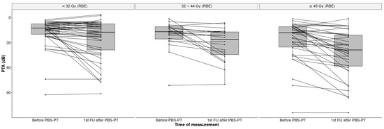 Boxplots of PTA (dB) in all 101 ears before and after PBS-PT according to the cochlear dose in Gy (RBE) (<32, 32–44, ≥45 Gy).
