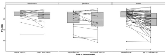 The median PTA increased significantly by 8.7 dB from 15 dB HL at the baseline to 23.7 dB HL (IQR 11.3–46.3) at the first follow-up, indicating an impairment of hearing sensitivity (p < 0.001). This impairment was more pronounced in the ipsilateral ears of patients with lateralized tumors (32.5 dB HL) than in patients with midline tumors (28.9 dB HL) (Figure 3).