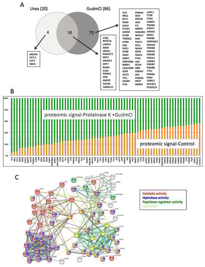 Proteolysis-resistant secretome screening as a tumor biomarker discovery approach. (A) Venn diagram showing an enrichment for a group of secretome proteins (labeled in the graph as GudmCl) that are not degraded by Prot K but need a harsh digestion protocol to be detected by LC-MS/MS. (B) Plot showing the different enrichment factors for the 70 proteins exclusively identified when using the Gu70-TrypLysC protocol. (C) STRING network analysis (https://string-db.org, accessed on 8 June 2020) of the 70 enriched proteins by Prot K digestion. The gene ontology analysis shows that most of these proteins are enzymes with hydrolase activity, or they reside in secretory granules and the lysosome.