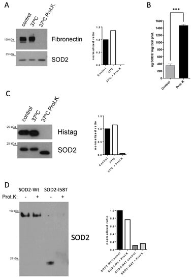 SOD2 is resistant to proteinase K degradation due to its quaternary structure. (A) The resistance of SOD2 to proteinase K activity was assessed by immunoblot in BT549 cells’ secretome and fibronectin was used as a degradation control. The secretomes were incubated at 37 °C o/n with or without Prot K, and a non-treated secretome was loaded as control. (B) SOD2 levels are also enriched in the digested BT549 secretome, when the samples are analyzed by ELISA. The mean of the triplicates and SD is shown. *** p-value < 0.001 (C) WB showing that SOD2 recombinant protein is resistant to Prot K activity, except for its His-tag that is digested after incubation with Prot K. (D) SOD2-I58T mutant is unable to form tetramers and is sensitive to Prot K. The secretomes from BT549 WT cells and BT549-shSOD2 -I58T cells were incubated with or without Prot K. Secretomes were loaded into native non-SDS-PAGE to evaluate the quaternary structure of the proteins. Quantification of the immunoblot bands was performed with Image J. Protein levels were normalized to the control condition of each experiment (Figure S4).