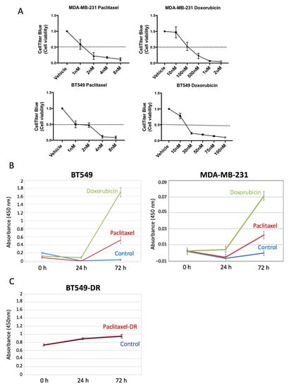 The breast cancer cell lines used in this project were purchased from ATCC and maintained at 37 °C in 5% CO2 and 95% humidified atmosphere air. Specifically, MDA-MB-231 and MCF7 cell lines were maintained in Dulbecco’s modified Eagle’s medium (DMEM/F12; Invitrogen, Waltham, MA, USA), and BT549 cells in RPMI medium (Invitrogen). All cell lines were supplemented with 10% fetal bovine serum (FBS, Invitrogen) and 2 mM L-glutamine (Invitrogen). When needed, cell lines were treated with paclitaxel (4 nM) or doxorubicin (30 nM or 2 µM). To generate a BT549 subline resistant to paclitaxel (BT549-DR cells), BT549 parental cells were treated chronically with 4 nM paclitaxel until they became resistant to the drug and started proliferating (Figure S2). The concentration to kill and/or inhibit growth of cells by 50% (IC50) of these drugs was quantified from drug–response curves by using CellTiter colorimetric assay analysis. The different cell lines were plated with four replicates for each condition (5000 cells/well) and after overnight incubation, drug treatment started. Specifically, the following drug concentrations were used: paclitaxel (1–8 nmol/L) and doxorubicin (1 nmol/L–2 μmol/L). Cell viability was measured after 72 h using the CellTiter assay (CellTiter-Blue Cell Viability Assay; Promega, Madison, WI, USA).