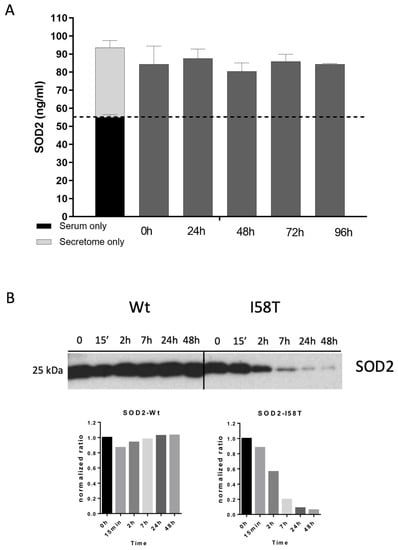 SOD2 is stable within human serum. (A) SOD2 levels were stable when incubated in human serum. Secretome from BT549 cells was spiked into human serum and incubated at 37 °C for 0 h (as initial control), 24 h, 48 h, 72 h, and 96 h. The levels of SOD2 were assessed by ELISA. The dashed line in the plot indicates the endogenous levels of SOD2 in the human serum used. (B) SOD2-I58T was degraded in human serum while SOD2-WT was resistant. Secretomes expressing WT-SOD2-histag or SOD2-I58T-histag were spiked into human serum and incubated up to 48 h. The two tagged proteins were purified using nickel beads at different time points (0 h, as control, 15′, 2 h, 7 h, 24 h, 48 h). An immunoblot was performed to detect SOD2 levels. Quantification of the immunoblot bands was performed with Image J. Protein levels were normalized to the control condition of each experiment.