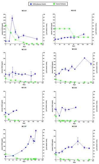 The results show that the samples obtained during the neoadjuvant treatment increased the circulating levels of SOD2 compared to BL samples when tumors were responding to the treatment. Therefore, this dataset suggests that the relationship between SOD2 plasma levels and tumor volume follows a negative correlation (Figure 5). Moreover, we observed different behaviors for the levels of SOD2 during the neoadjuvant treatment. One patient who achieved a quick clinical response presented an earlier elevation of SOD2 levels, independent of a chemotherapy agent and/or BC subtype (NEO.01). Similar results were observed for patients NEO.04 and NEO.08, where the levels of SOD2 increased correlating with the response to the drug, although slower than for NEO.01. Conversely, patients who presented a slow and progressive clinical response (NEO.02, NEO.03) had a less steep ascent in the curve of SOD2 levels. The treatment for patients NEO.05 and NEO.06 was stopped early because of toxicity. However, the trend of the curve followed by SOD2 levels at the time of finalizing the treatment was clearly ascending, and therefore following a negative correlation with respected of tumor size. Taking into account these results, we also included a patient diagnosed with Luminal A BC who underwent neoadjuvant treatment due to a locally advanced disease (cT3N0M0) and was a premenopausal woman (NEO.07). In this case, we also could also observe a negative correlation between tumor volume and SOD2 plasma levels. Therefore, our results suggest that circulating SOD2 is a candidate biomarker of drug response, although further work is needed to assess the full potential of this biomarker. We envision that the robustness of SOD2 could make of this protein an ideal circulating tumor biomarker for cytotoxic cancer therapies.