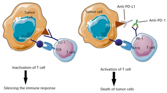 Binding T-cells by their TCR to an antigen expressed on the cell surface, leads to T-cell activation, proliferation, PD-1 upregulation, and inflammatory cytokine production. Their secretion may contribute to PD-L1 expression on the cancer cell surface, and subsequently after PD-1 and PD-L1 binding, results in suppression of TCR-mediated immune response [24]. Sustained expression of PD-1 and its ligands is usually noticeable during certain conditions—such as chronic infections or cancer. Thus, improvement of T-cell functions and reduction of tumor burden may be achieved by blocking the PD-1 pathway [25,26].