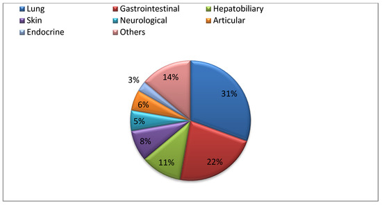 Type and incidence of Grade 3–4 irAEs. Grade 3–4 irAEs occurring in the series of 201 consecutive patients receiving ICI from 1 January 2016 to 31 December 2019 are summarized in a pie chart, showing that the most prevalent Grade 3–4 irAEs are respiratory (31%) and gastrointestinal (22%) while endocrine Grade 3–4 irAEs are rare (3%), linked to non-thyroid irAEs.