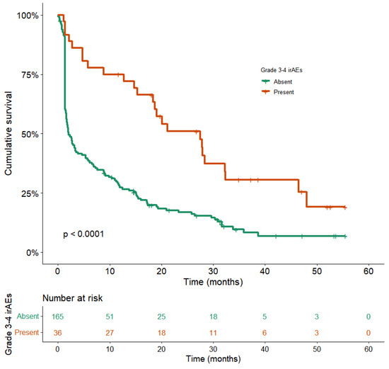 Overall survival according to the incidence of Grade 3–4 irAEs. Kaplan–Meier overall survival plots according to the incidence of Grade 3–4 irAEs are shown. Orange OS curve: patients with Grade 3–4 irAEs (n = 165), median OS: 27.8 months (95%CI: 17.0–38.7). Green OS curve: patients without Grade 3–4 irAEs (n = 36), median OS: 8.1 (95% CI: 5.9–10.4). (p < 0.0001, log-rank test).