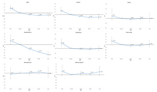The results of our study are consistent with previous studies, as low BMI was associated with a higher risk of HNC. However, there were some differences in the HNC subtype risk analysis. The authors of the prospective NIH AARP cohort study showed an inverse association between HNC and BMI that was almost exclusively among current smokers (HR: 0.76) [14]. In a Dutch cohort study, oral cavity and oropharyngeal cancers had the strongest inverse association with BMI [6]. Our results confirm previous findings that oral, oropharyngeal, and laryngeal cancers are associated with a low BMI; however, the inverse association between BMI and oral cavity cancer failed to reach statistical significance (p = 0.0637). Our results suggest that the relationship between the risk of sinus, salivary gland, and nasopharyngeal cancers differed from that of other HNCs.