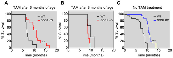Increased survival of p210BCR/ABL transgenic mice upon SOS1/2 ablation. Kaplan–Meier survival plots show that single SOS1-KO (red lines) or SOS2-KO (blue lines) transgenic mice increase their survival in comparison with transgenic SOS1 and 2-WT mice (black lines). (A) Animals were fed with tamoxifen-containing chow from the age of 6 months to induce the ablation of SOS1. WT: n = 9; SOS1-KO: n = 13; ** p < 0.01 vs. WT. (B) Animals were fed with tamoxifen-containing chow from the age of 8 months to induce the deletion of SOS1. WT: n = 3; SOS1-KO: n = 7. (C) Animals without tamoxifen treatment. WT: n = 8; SOS2-KO: n = 19; *** p < 0.001 vs. WT.