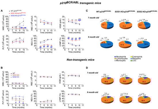 As previously described, the initial CML-related hematological alterations in the p210BCR/ABL transgenic mouse strain used in our studies started to be easily detectable at about 6 months of age and then quickly progressed during the ensuing 2–4 months (7–9 months of age) until culminating into the full-blown disease and the eventual death of the diseased animals. To ascertain the mechanistic relevance of the SOS1 and SOS 2 GEFs in the development of CML, here, we compared the various hematological parameters of the WT, SOS1-KO, and SOS2-KO transgenic (p210BCR/ABL) and non-transgenic mice (Figure 3).