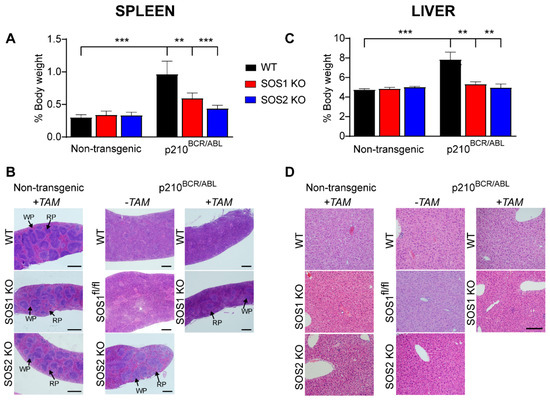 Splenomegaly and, less frequently, hepatomegaly are also often described as pathological alterations associated with CML [41,42]; thus, we also wished to test and compare the effect of SOS1/2 genetic ablation on the size and histological structure of these hematopoietic organs in our non-transgenic and transgenic p210BCR/ABL mice (Figure 4).