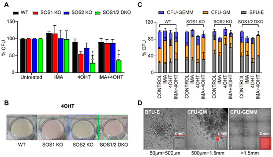 Hematopoietic stem cells (HSPCs) are relevant for CML pathogenesis and also for intrinsic or acquired therapy resistance, relapse, and disease progression [43,44]. In order to obtain a deeper mechanistic insight into the functional contribution of SOS1 and/or SOS2 to the process of CML development, here, we isolated the compartment of hematopoietic stem cells (HSPCs) from p210BCR/ABL transgenic animals of the four relevant SOS genotypes (WT, SOS1-KO, SOS2-KO, and SOS1/2-DKO) and compared their functionality using in vitro colony-formation assays under different experimental conditions, including a TAM treatment for SOS1 ablation and/or imatinib treatments (Figure 5).