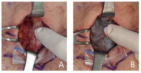 (A). Application of fibrin glue on the lymph node dissection site (control group). (B). Application of a polyglycolic acid mesh (Neoveil™) after applying fibrin glue on the lymph node dissection site (treatment group).
