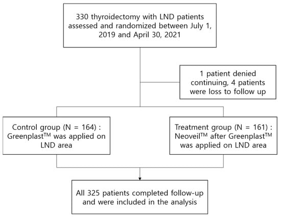 This study was designed as a prospective, open-label, randomized, controlled trial at a single university hospital. Patients aged 20–70 years who were diagnosed with PTC or suspicious PTC by fine-needle aspiration cytology and scheduled for thyroidectomy with neck lymph node dissection were enrolled in this study. The inclusion criteria were as follows: tumors without perithyroidal organ infiltration, no clinical evidence of distant organ metastasis, normal vocal cord function on laryngoscopic or laryngeal ultrasound prior to surgery, and no significant abnormal laboratory findings before surgery.