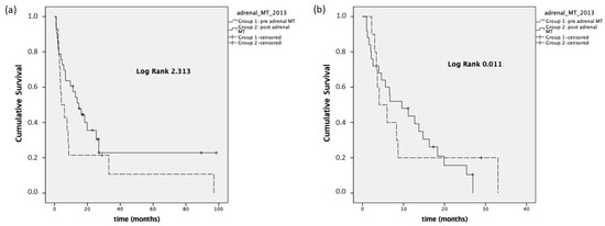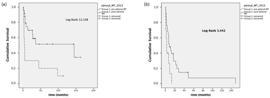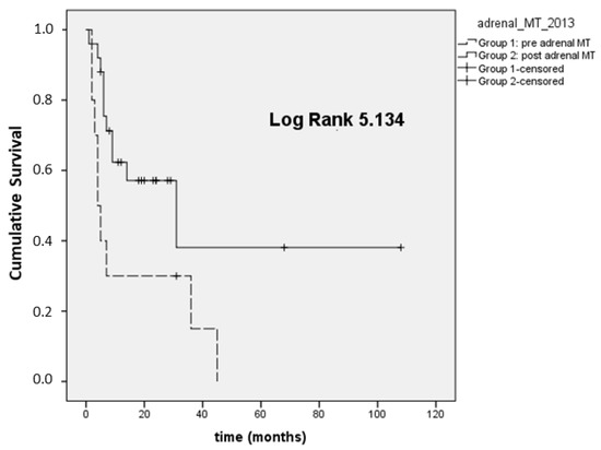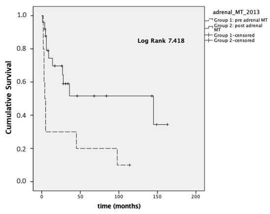 Regarding the total number of treatments, we found no difference between the number of therapies performed over the years in the two groups, even since 2013 with the establishment of adrenal MTE. Despite this, the survival rate was increased in Group 2, probably thanks to the higher expertise and the better quality of treatments achieved over the years, with correct timing of application, in a context of personalized therapy.