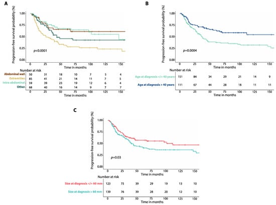 (A) Kaplan–Meier curves show progression-free survival (PFS) in patients with intra-abdominal desmoid tumors (DTs) compared to those with DTs of the extremities, DTs of the abdominal wall and DTs affecting other locations. (B) Kaplan–Meier curves show progression-free survival (PFS) in patients with DTs and age at diagnosis equal to or lower than 40 years compared to those with age at diagnosis greater than 40 years. (C) Kaplan–Meier curves show progression-free survival (PFS) in patients with DTs of size at diagnosis equal to or smaller than 60 mm compared to patients with tumor size greater than 60 mm. p-values were calculated with the Log-Rank method.