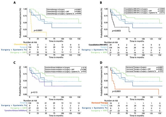 Time to next treatment (TTNT) after first-line therapy in patients with desmoid tumors. Kaplan–Meier curves show comparison of TTNT between patients treated with first-line chemotherapy (A), cryoablation or MR-HIFU (B), tyrosine kinase inhibitors (C), or hormonal therapy (D) versus surgery alone, surgery plus adjuvant radiotherapy (XRT) or surgery plus adjuvant systemic therapy. P-values were calculated with the Log-Rank method. XRT: radiotherapy; Systemic Tx: Systemic therapy; MR-HIFU: Magnetic resonance-guided high intensity focused ultrasound; Surgery plus systemic therapy includes surgery plus adjuvant chemotherapy, surgery plus adjuvant hormonal therapy, surgery plus imatinib.