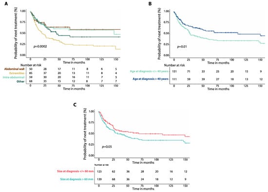 (A) Kaplan–Meier curves show time to next treatment (TTNT) after first-line therapy in patients with intra-abdominal desmoid tumors (DTs) compared to those of the extremities, of the abdominal wall and those affecting other locations. (B) Kaplan–Meier curves show time to next treatment (TTNT) in patients with DTs and age at diagnosis equal to or lower than 40 years compared to those with age at diagnosis greater than 40 years. (C) Kaplan–Meier curves show time to next treatment (TTNT) in patients with DTs and size of tumor at diagnosis equal to or smaller than 60 mm compared to patients with tumor size greater than 60 mm. p-values were calculated with the Log-Rank method.