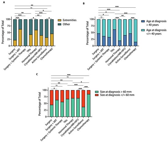 Tumor location, age at diagnosis and tumor size by treatment group in patients with desmoid tumors (DTs). (A) Bar graph shows the proportion of patients with DTs of the extremities compared to DTs involving other locations in each treatment group. (B) Bar graph shows the proportion of patients older than 40 years and 40 years or younger at diagnosis in each treatment group. (C) Bar graph shows the proportion of patients with tumors greater than 60 mm and 60 mm or smaller at diagnosis in each treatment group. XRT: radiotherapy; MR-HIFU: Magnetic resonance-guided high intensity focused ultrasound; TKIs: Tyrosine kinase inhibitors. (* p < 0.05; ** p < 0.01; *** p < 0.001; ns: non-statistically significant, Chi-square test).