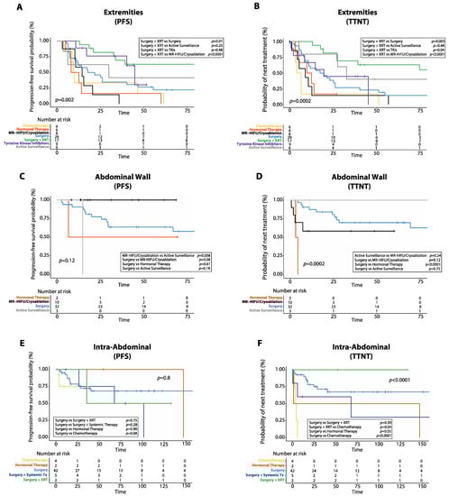 Progression-free survival (PFS) and time to next treatment (TTNT) after first line treatment in desmoid tumors (DTs) arising at different anatomical sites. (A) Kaplan–Meier curve shows PFS after first-line treatment in DTs of the extremities. (B) Kaplan–Meier curve shows TTNT after first-line treatment in DTs of the extremities. (C) Kaplan–Meier curve shows PFS after first-line treatment in DTs of the abdominal wall. (D) Kaplan–Meier curve shows TTNT after first-line treatment in DTs of the abdominal wall. (E) Kaplan–Meier curve shows PFS after first-line treatment in intra-abdominal DTs. (F) Kaplan–Meier curve shows TTNT after first-line treatment in intra-abdominal DTs. XRT: radiotherapy; MR-HIFU: magnetic resonance-guided high intensity focused ultrasound; Systemic Tx: systemic therapy.