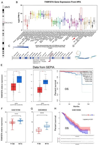 - Ma, Y.F.; Li, G.D.; Sun, X.; Li, X.X.; Gao, Y.; Gao, C.; Cao, K.X.; Yang, W.G.; Yu, M.W.; Wang, X.M. Identification of FAM107A as a potential biomarker and therapeutic target for prostate carcinoma. Am. J. Transl. Res. 2021, 13, 10163–10177. [Google Scholar]