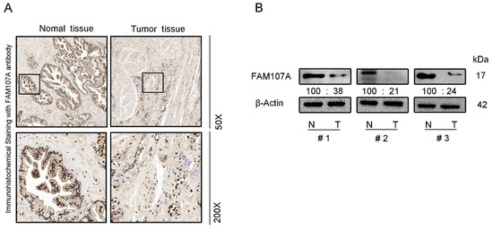FAM107A expression was higher in normal prostate tissues than in prostate cancer tissues. (A) Measurement of protein levels of FAM107A in normal and prostate cancer tissues by immunohistochemical analysis. Representative images were shown at magnifications of 50× and 200×, respectively. (B) Protein levels of FAM107A in normal and prostate cancer tissues by Western blotting.