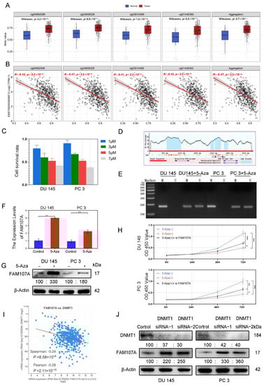 FAM107A exhibits low expression in prostate cancer cells due to hypermethylation of its promoter region. (A) cg04992588, cg24659328, cg2615468, and cg01446993 were used as probes to detect the promoter methylation level of the FAM107A gene in normal and tumor tissues (http://www.bioinfo-zs.com/smartapp/ (accessed on 1 June 2022)). (B) cg04992588, cg24659328, cg2615468, and cg01446993 probes were negatively correlated with FAM107A gene expression. (C) Growth inhibitory effect of different concentrations of 5-Aza on prostate cancer cells. (D) The methylation region of the promoter (CpG island) of the primer. (E) MSP analysis of the methylation status of the FAM107A promoter before and after 5-azacytidine treatment. “ U “indicates amplification without methylation, and” M “indicates amplification with methylation. (F) 5-Aza treatment rescues the mRNA expression of FAM107A. (G) Effect of 5-azacytidine on FAM107A protein expression in prostate cancer cells by Western blotting. (H)Analysis of the effects of 5-Aza and FAM107A siRNA on cell proliferation according to a CCK8 assay. (I) Correlation between FAM107A and DNMT1 was analyzed using the prostate cancer dataset included in the Cbioportal database (https://www.cbioportal.org/ (accessed on 1 June 2022)). (J) Effect of DNMT1 on FAM107A protein expression in prostate cancer cells as determined by Western blotting. *** for p < 0.001, ** for p < 0.01 and * for p < 0.05.