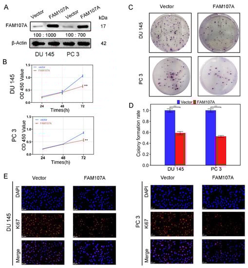 The CCK-8 assay showed that the cell proliferation ability of the pc-FAM107A group was significantly decreased compared to that of the pc-Vector group starting from the third day, indicating that the overexpression of FAM107A inhibited the proliferation and growth of prostate cancer cells (p < 0.01) (Figure 4B). A 14-day colony formation assay also showed that FAM107A overexpression reduced the colony formation ability of PC3 and DU145 cell lines (p < 0.001) (Figure 4C,D). The results of the Ki67 immunofluorescence assay also confirm that the Ki67 expression of cells in the pc-FAM107A group was lower than that of cells in the pc-Vector group (Figure 4E).