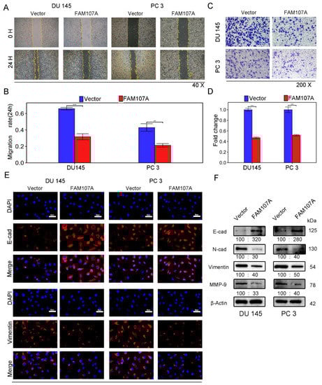 We revealed that restoring FAM107A expression in prostate cancer cell lines such as DU 145 and PC 3 inhibited cell cycle progression, increased the proportion of cells in G1, and inhibited the expression of cyclin D1, a key protein in the G1 phase. It also inhibited cell proliferation, migration, and invasion and resulted in apoptosis. EMT, defined as the process by which tumor cells acquire properties of mesenchymal cells, is a critical step for cancer cell recurrence and metastasis and is associated with tumor cell migration in vitro [31,32]. Downregulation of E-cadherin and upregulation of mesenchymal markers, including N-cadherin and wave proteins, are molecular markers of EMT. Additionally, the matrix metalloproteinase family (MMP) is involved in the EMT process in different types of cancer [33]. According to our findings, the overexpression of FAM107A elevated E-cadherin expression, reduced N-cadherin and vimentin expression, and interfered with EMT in tumor cells. The expression of MMP-9 was also found to decrease after FAM107A overexpression, suggesting that FAM107A overexpression reduces tumor aggressiveness. These results indicate that FAM107A might influence the EMT process in PCa cells.