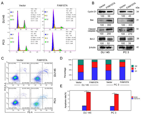 Flow cytometry was used to detect changes in the cell cycle and the apoptosis rate of DU145 and PC3 cells after FAM107A overexpression. In the PC-FAM107A group, the fraction of cells in phase G1 increased dramatically in the DU145 and PC3 cell lines (Figure 6A,D), showing that cells were blocked in phase G1 after FAM107A overexpression. The results of flow cytometry further reveal that the proportion of apoptotic cells in the PC-FAM107A group was higher than in the PC-vector group (Figure 6C,E). Overexpression of FAM107A lowered the production of G1-phase-associated protein (Cyclin D1), increased the production of apoptotic indicators Bax and cleaved caspase-3, and decreased the expression of Bcl-2, according to Western blotting data (Figure 6B).