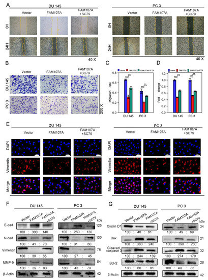 SC79 also increased the area of scratch wound healing in the wound healing assay (Figure 8A,C) and the number of invading cells in the Transwell invasion test (Figure 8B,D). Because phosphorylated AKT induces the expression of EMT markers, and we have previously demonstrated that overexpression of FAM107A results in increased expression of E-cadherin and decreased expression of N-cadherin, Vimentin, and MMP-9, we suspected that SC79 could antagonize the effects of FAM107A overexpression. The Western blotting results confirm this conjecture. Under the action of SC79, we detected a partial decrease in E-cadherin expression and a partial increase in the expression of N-cadherin, Vimentin, and MMP-9. And Vimentin immunofluorescence experiments confirmed the above changes (Figure 8E,F).We further explored the changes in the cell cycle and apoptosis-related proteins following the use of SC79. SC79 could partially antagonize cyclin D1, as well as changes in Bax, cleaved caspase-3, and Bcl-2 expression(Figure 8G).