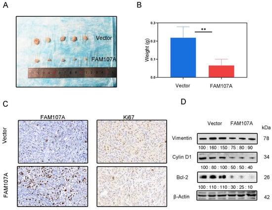 DU145 cells expressing pc-Vector or pc-FAM107A were injected into mice to determine whether FAM107A can decrease cancer growth in vivo. We discovered that mouse tumor models injected with pc-FAM107A cells were much smaller than those in the control group thirty days after the start of the experiment (Figure 9A). The average tumor weight of tumor cells in mice injected with pc-FAM107A cells was only half that of the control group (Figure 9B). The immunohistochemical results also show a significant decrease in Ki67 expression in tumors of the pc-FAM107A-injected group (Figure 9C,D). We also used Western blotting to confirm that Vimentin, cyclin D1, and Bcl-2 were reduced in the pc-FAM107A group (Figure 9D).