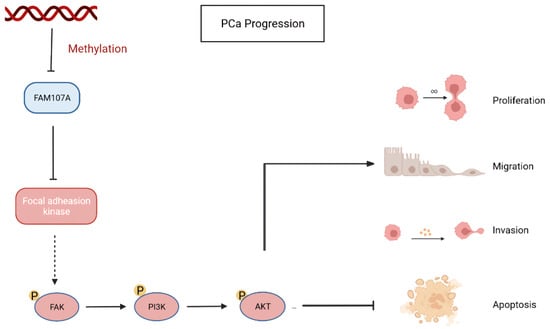Here, we provide clear evidence that FAM107A acts as a downregulated gene in PCa. Furthermore, promoter hypermethylation is the epigenetic mechanism that leads to its downregulation in PCa. Overexpression of FAM107A inhibits the FAK/PI3K/AKT pathway, prevents PCa cell proliferation, and promotes apoptosis. This research can hopefully bridge the gap between the current function and the regulation of FAM107A in PCa, while providing a rationale for further exploration of therapeutic targets in PCa.